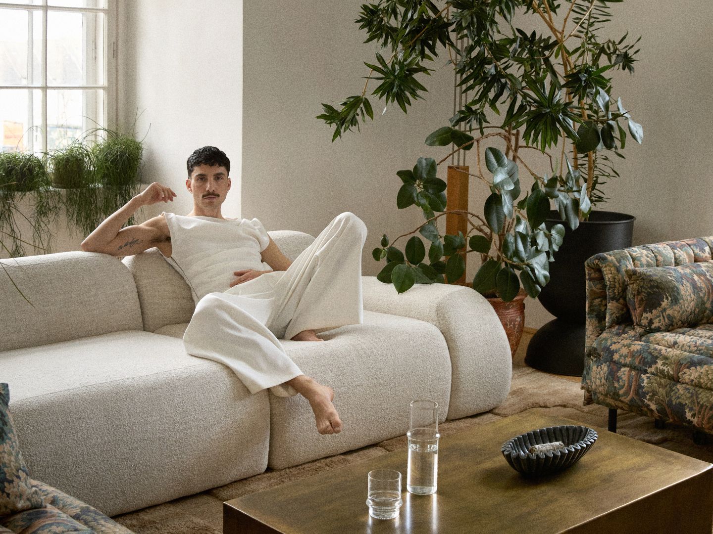 Mit Blick in den Garten strahlt das offene Wohnzimmer Wärme aus. Cremefarbene Polstermöbel bieten eine bequeme Sitzgelegenheit beim Afternoon Tea, während skulpturale Holzmöbel und große Pflanzen dem Look eine persönliche Note verleihen.