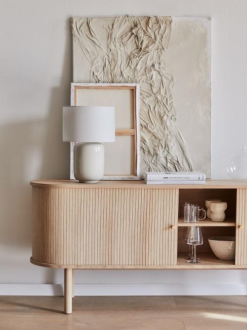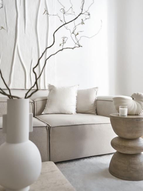 Ebenfalls für mehr Gemütlichkeit in Deinem Wohnzimmer sorgen verschiedene Naturmaterialien. Achte etwa darauf, einen schlichten Couchtisch oder eine Konsole aus Holz zu kombinieren. Deko-Kissen aus Leinen oder Baumwolle erzielen denselben Effekt. Ebenfalls ein stilvolles Highlight: eine dezente Vase aus Keramik.