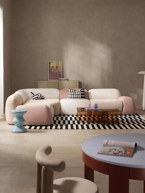 Luxus Wohnung einrichten Wohnzimmer Sofa mit vielen Kissen und Decke in hellrosa